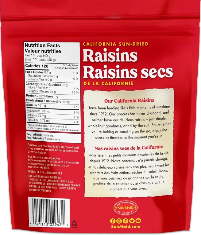 Sunmaid California Raisins are a naturally sweet and nutritious dried fruit snack. This 750g resealable pouch contains premium, sun-dried raisins grown in California, with no added sugars or preservatives. Ideal for snacking, baking, cooking, or adding to cereals and desserts.